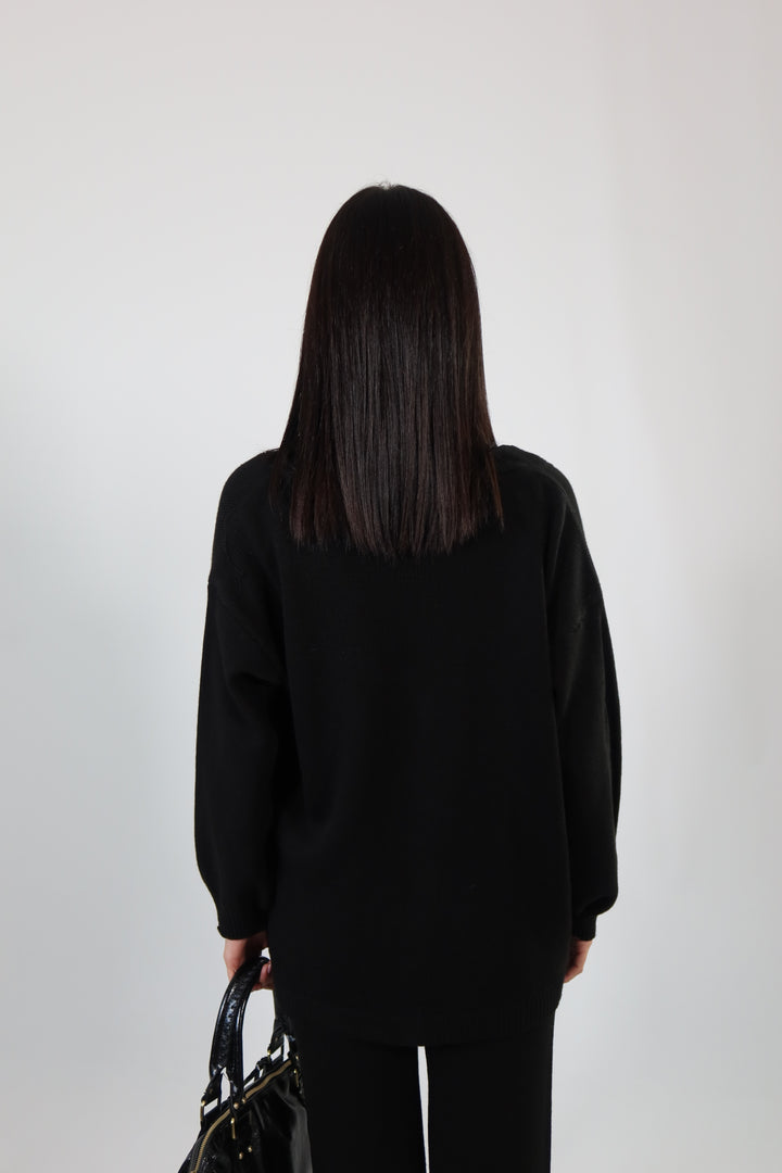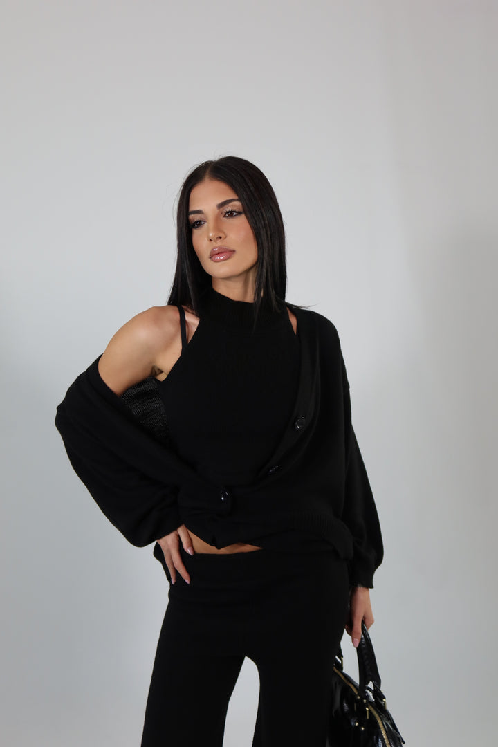 Tris in maglia: top, cardigan over con bottoni e pantalone in lanetta morbido.