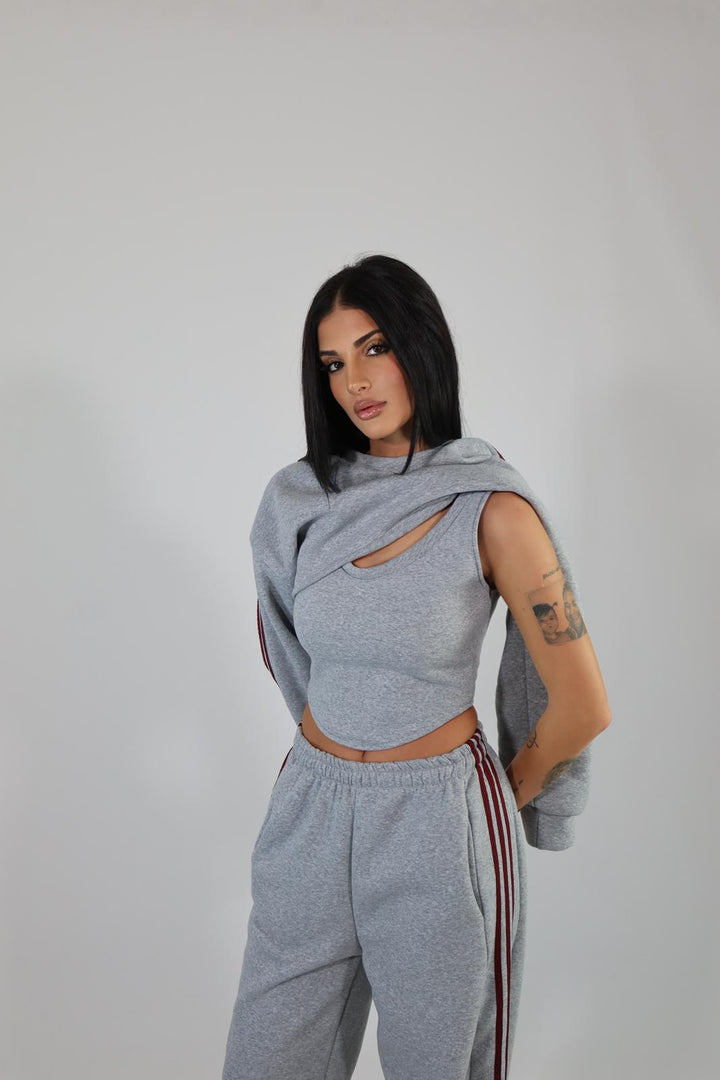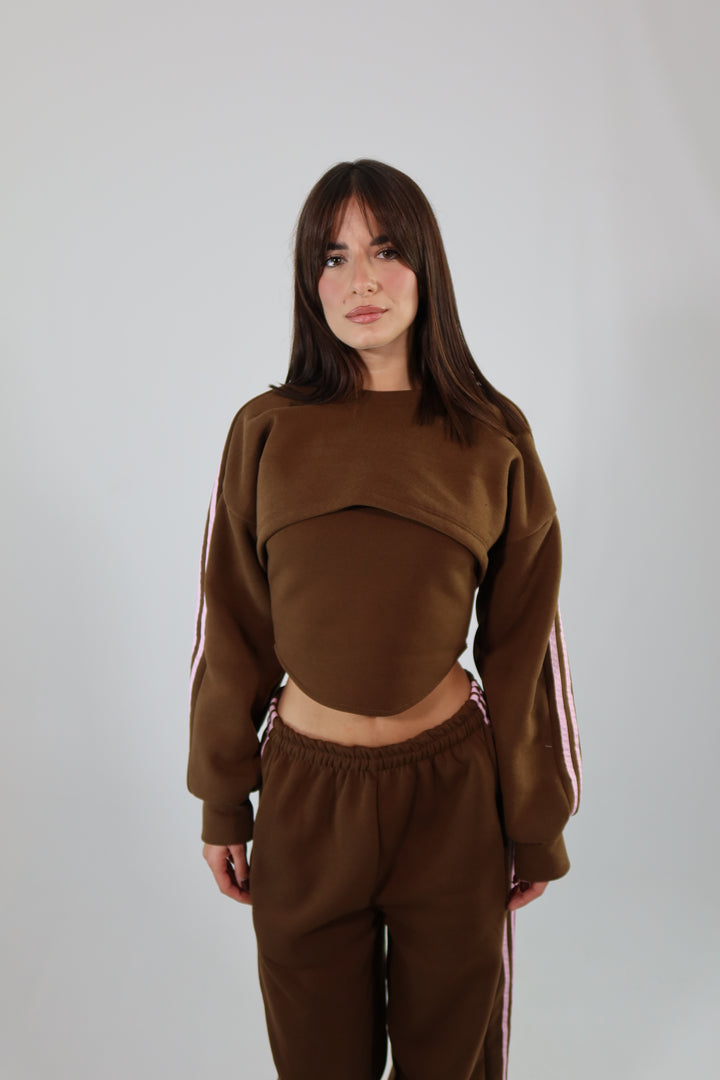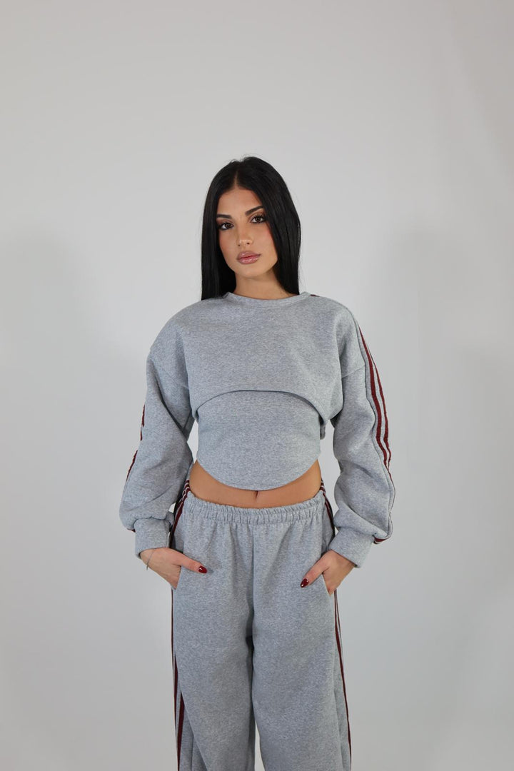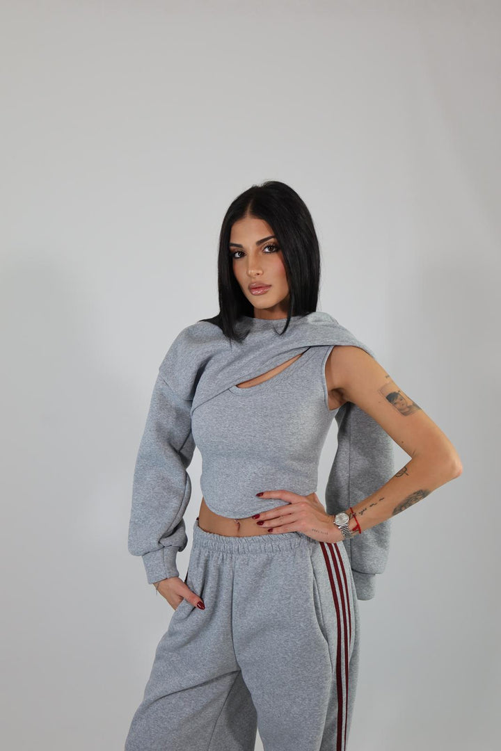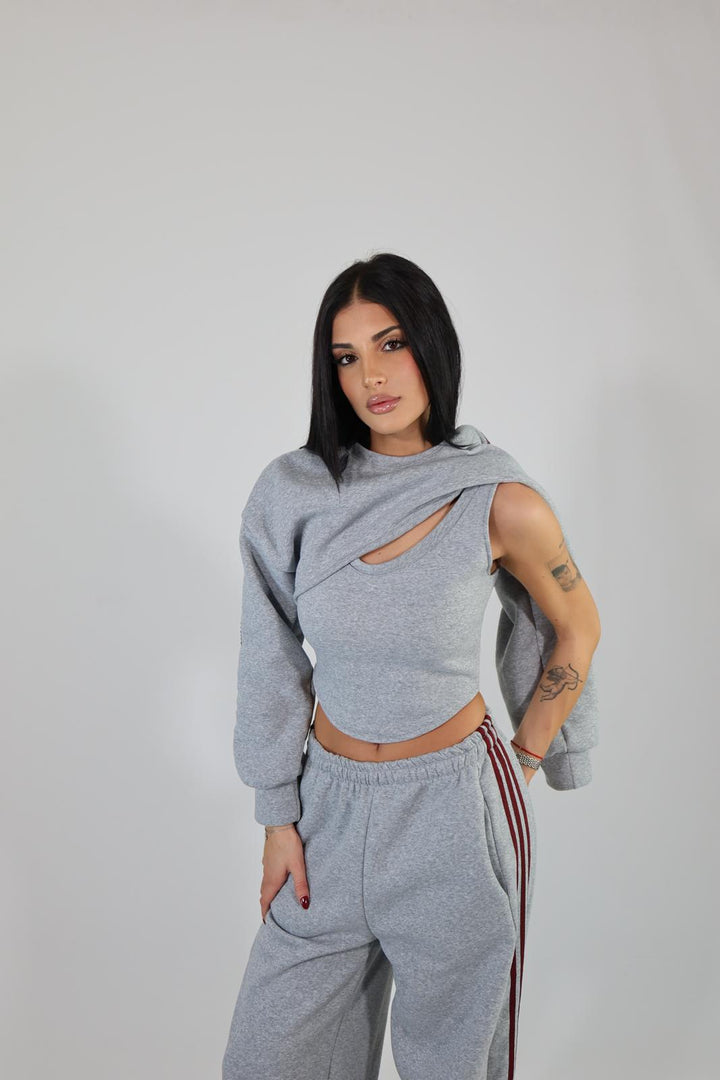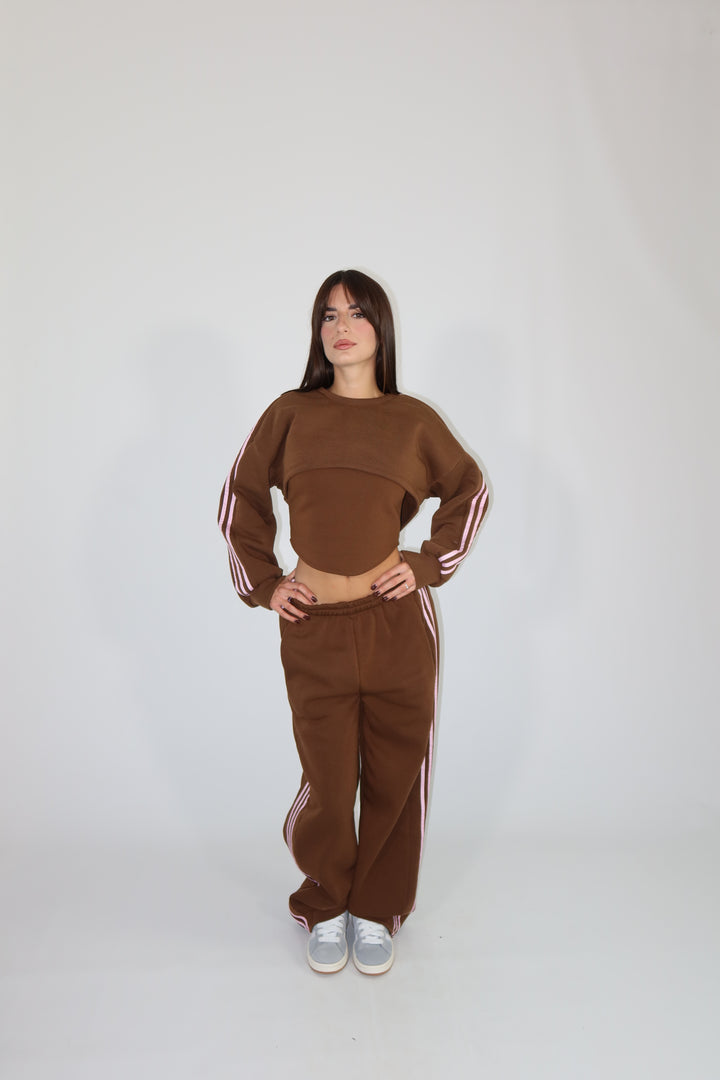 Tris felpato: canotta, felpa e pantalone morbido con strisce laterali. Si adatta dalla XS ad una taglia M/L.