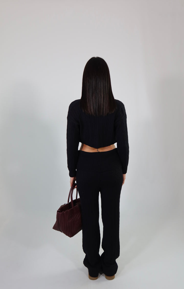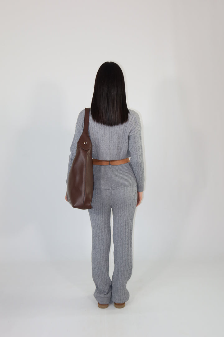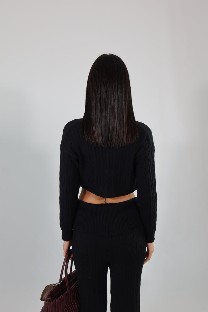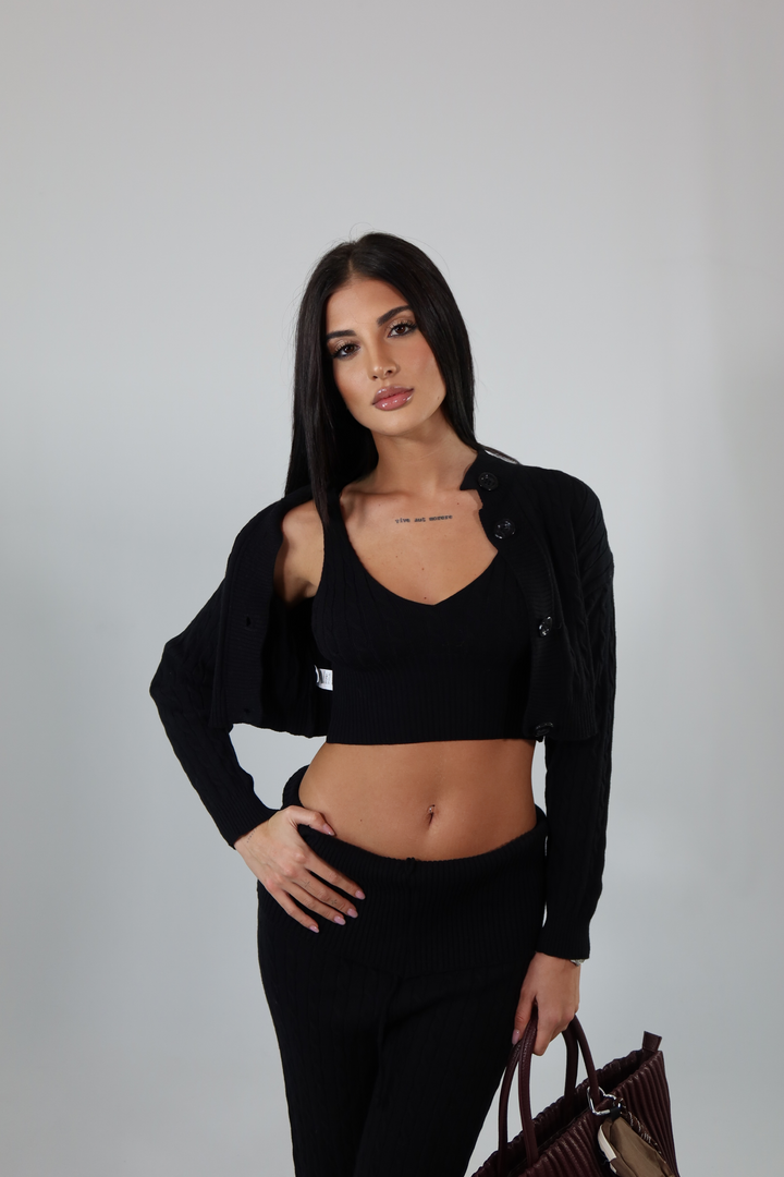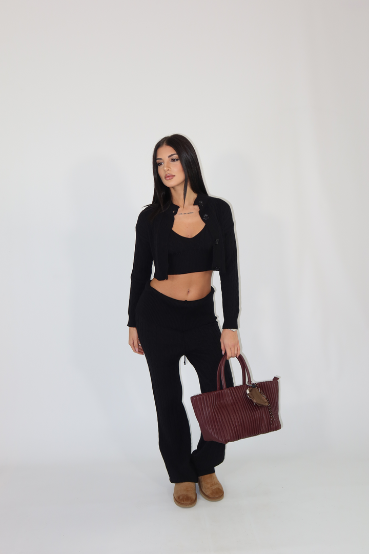 Tris in lanetta: top, cardigan e pantalone morbido con risvolto.